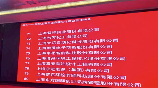 2018年12月21日,上海市企业联合会正式发布了“2017-2018上海企业品牌文化建设百佳榜单”,上海鹏盾电子商务股份有限公司以优秀的企业文化建设成果入选。