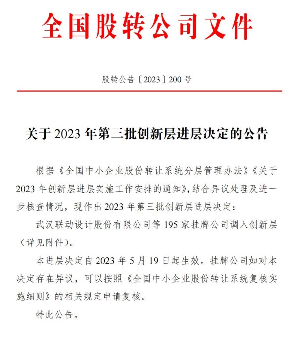 根据《全国中小企业股份转让系统分层管理办法》、《关于2023 年创新层进层实施工作安排的通知》,全国中小企业股份转让系统有限责任公司于2023年5月17日发布《关于 2023年第三批创新层进层决定的公告》(股转公告【2023】200号),上海鹏盾能源集团股份有限公司正式调入创新层,进层决定于2023年5月19日起生效。进入创新层后,投资人交易门槛不低于100万元即可。